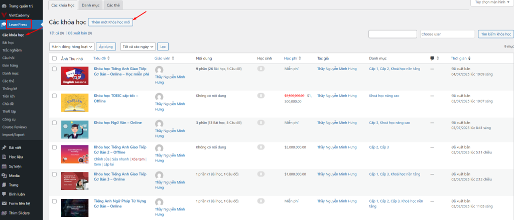- Ở thanh menu bên trái, tìm và nhấp vào LearnPress → Các khóa học.