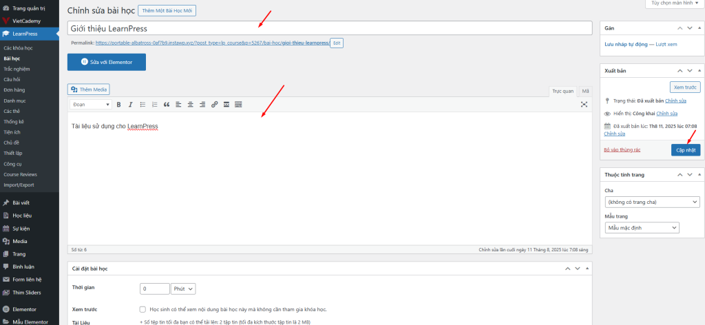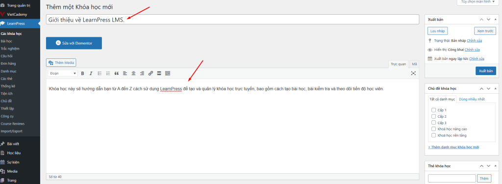 - Nhập tiêu đề bài học (VD: Giới thiệu LearnPress).