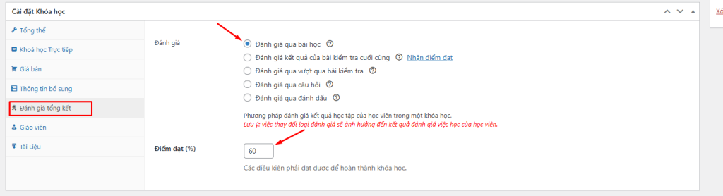 - Đánh giá qua bài học: Khóa học sẽ pass nếu bạn vượt qua được số phần trăm mà bạn đã set cho điểm đạt (Ví dụ: có 10 bài học bạn set điểm đạt để vượt qua là 60% thì bạn cần hoàn thành 6 bài trở lên để có thể pass khóa học)