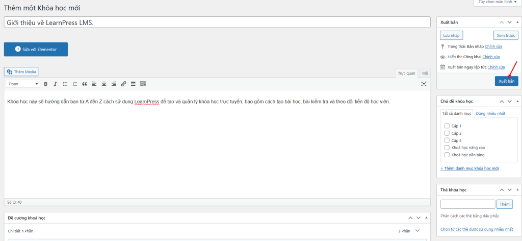 - Thêm mô tả ngắn gọn, súc tích giới thiệu khóa học ở khung soạn thảo đầu trang – đây là phần hiển thị ở trang danh sách khóa học. Ví dụ: Khóa học này sẽ hướng dẫn bạn từ A đến Z cách sử dụng LearnPress để tạo và quản lý khóa học trực tuyến, bao gồm cách tạo bài học, bài kiểm tra và theo dõi tiến độ học viên.